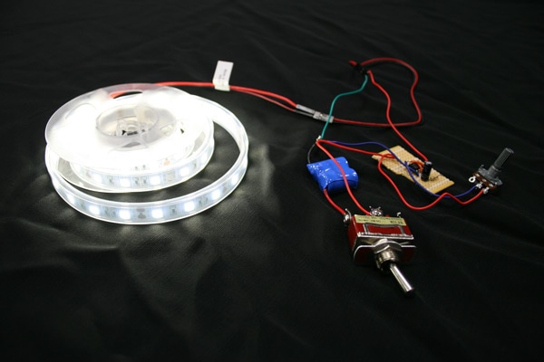 I replaced a 4.7KΩ resistor with a 50kΩ potentiometer, wired only two terminals to change it to a variable resistor, and plugged the battery back in. Further success! Using my aforementioned moderate soldering skills, I recreated the circuit on a perf board and added an SPST switch. Still amazed that the circuit worked, I placed everything except the LED strip in a project box and started photographing my successful build.