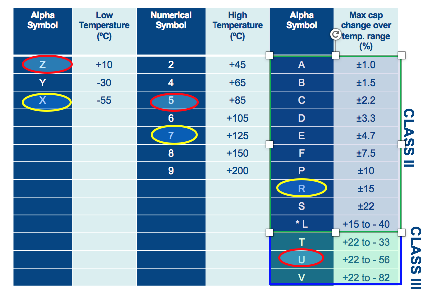 Figure 1: This table represents a ceramic capacitor’s Class II temperature coefficients. (Source: KEMET)