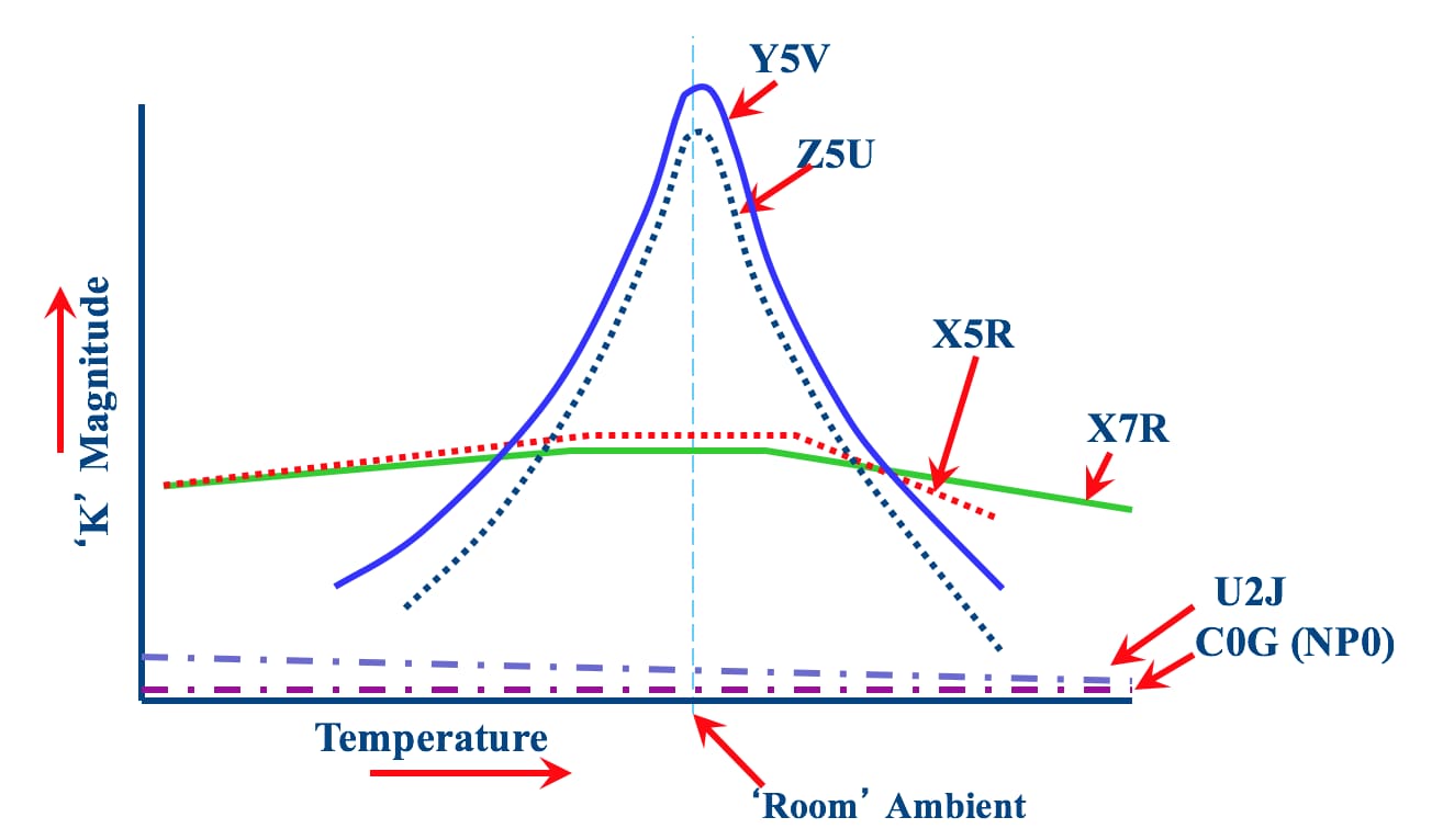Figure 2: This graph represents MLCC relative permittivity change vs. temperature (Class I, II, and III). (Source: KEMET)