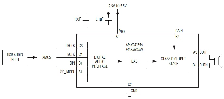 efficiency. Both the MAX98355A and MAX98355B ICs from Maxim are