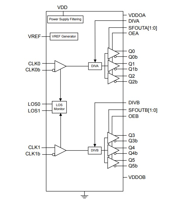 - Loss Of Signal (LOS) monitors for loss of input clock